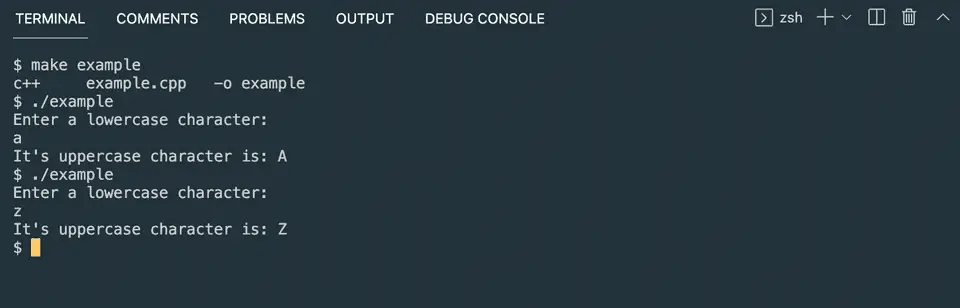 - The last line is printing the uppercase character, i.e. c.