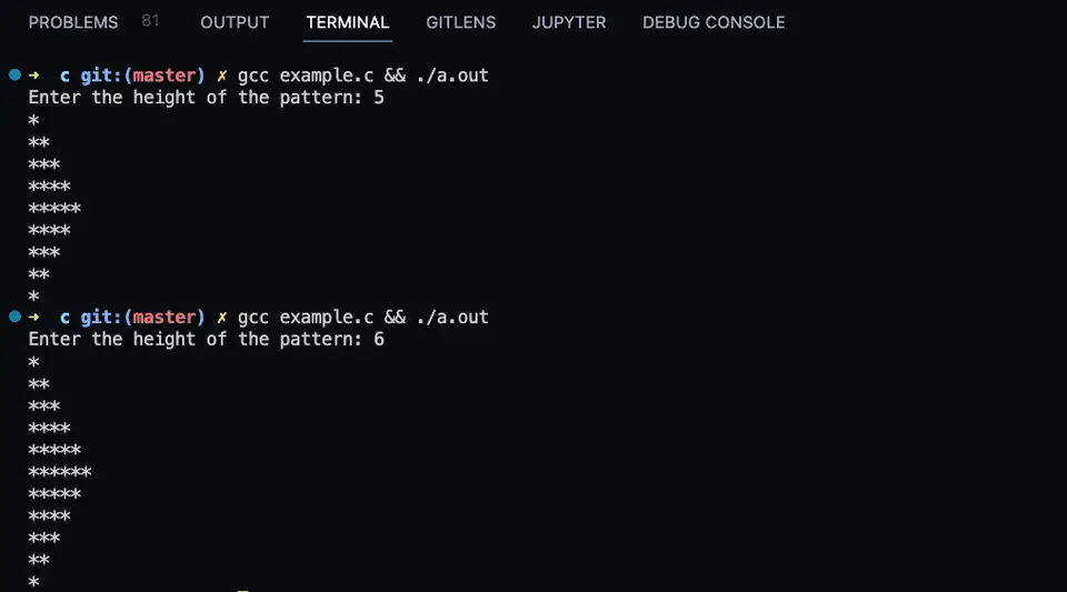 Let’s use a separate function to print the pattern. This function will take the height of the pattern as its parameter and it will print the pattern. We can use for loops or while loops to print it as shown in the previous examples. Let me show you with for loops and a separate function: