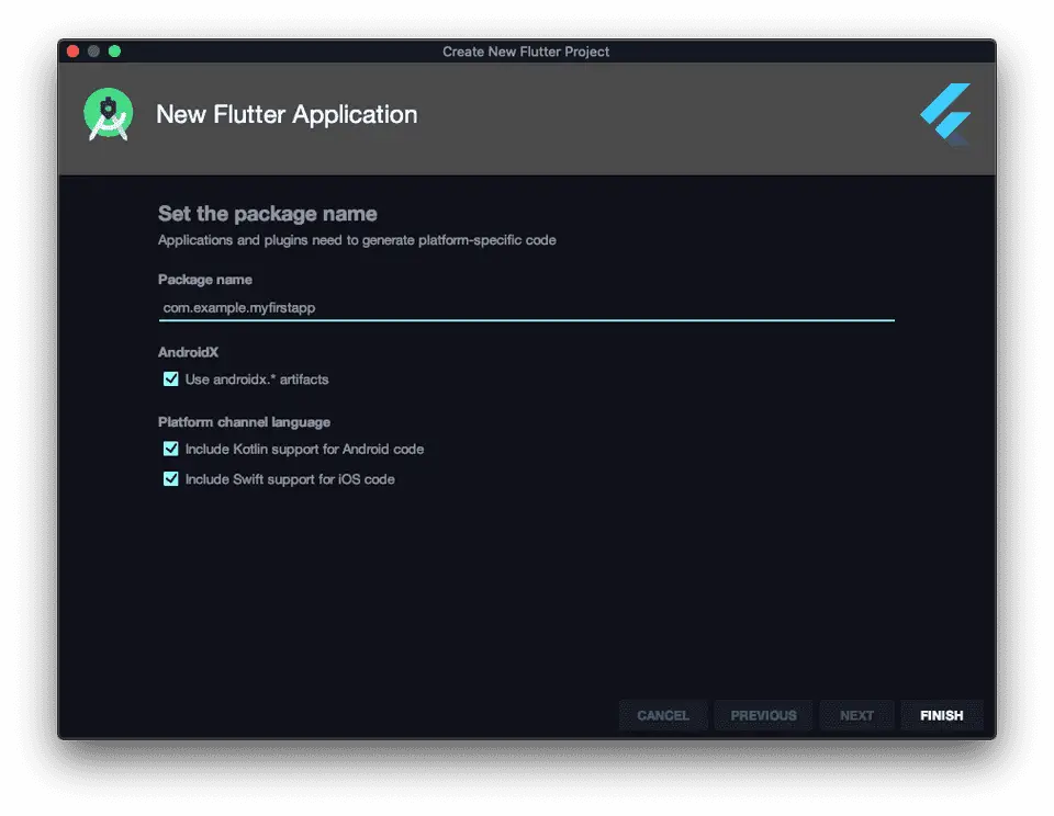 - Click next and add one package name for your application. This package name is unique for each application. Don’t worry about that now. You can change it later before releasing it on play store. Click on Finish and done. It will start creating your flutter app.