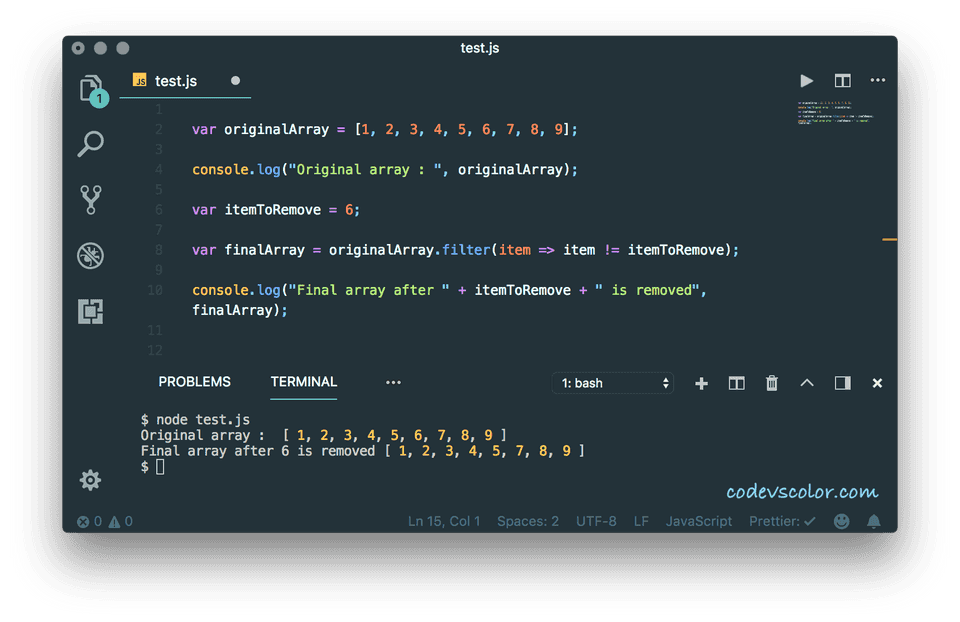 filter() can be used to remove one value from an array in JavaScript. It will not change the original array. Based on one condition, it will create one different array filtering out the original array. Let’s try to implement it :