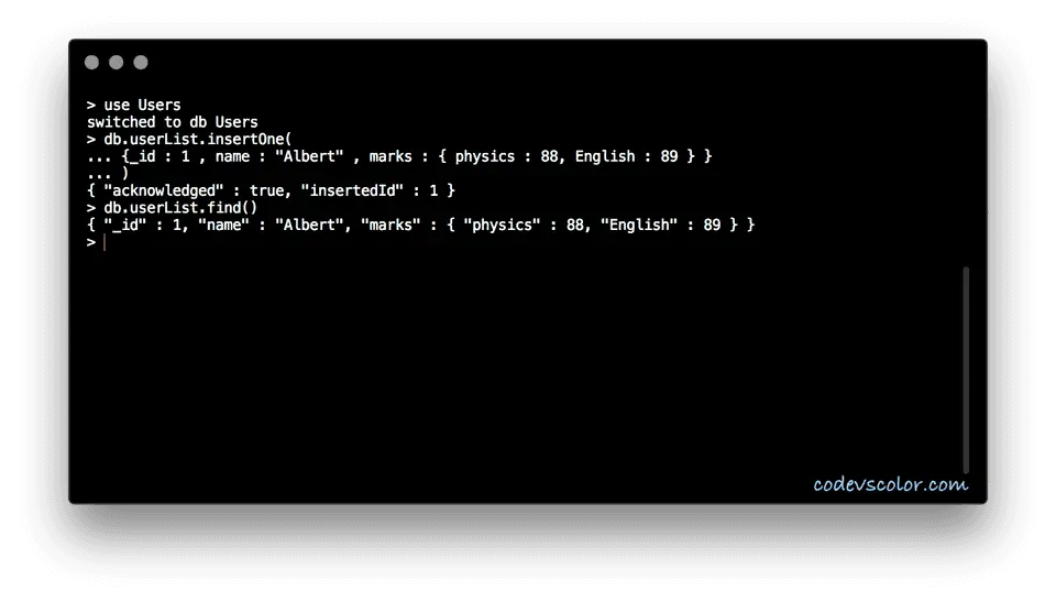 > db.userList.insertOne( {_id : 1 , name : "Albert" , marks : { physics : 88, English : 89 } } )