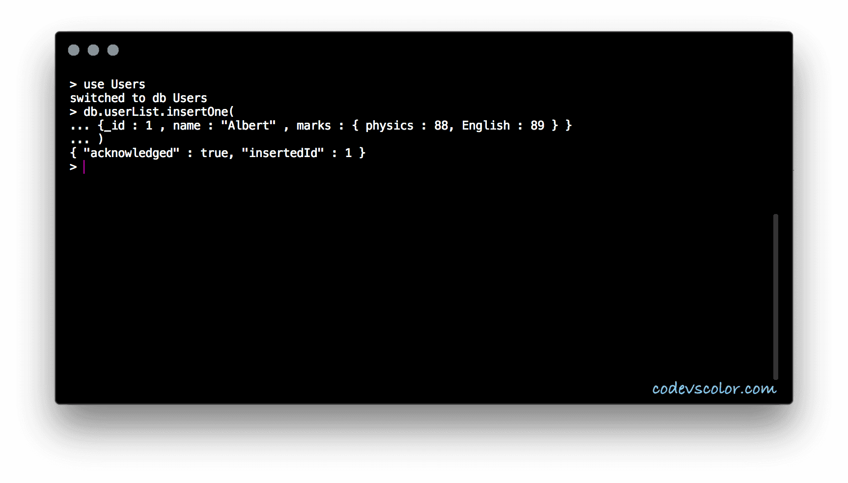 > db.userList.insertOne( {_id : 3 , name : "Bob" , marks : { physics : 80, English : 91 } } )
