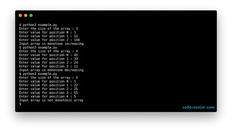 In this python programming tutorial, we will learn how to find if an array is monotonic or not. An array is called monotonic if its adjacent numbers are either increasing or decreasing. Monotonic arrays are divided into two categories: monotone increasing and monotone decreasing.