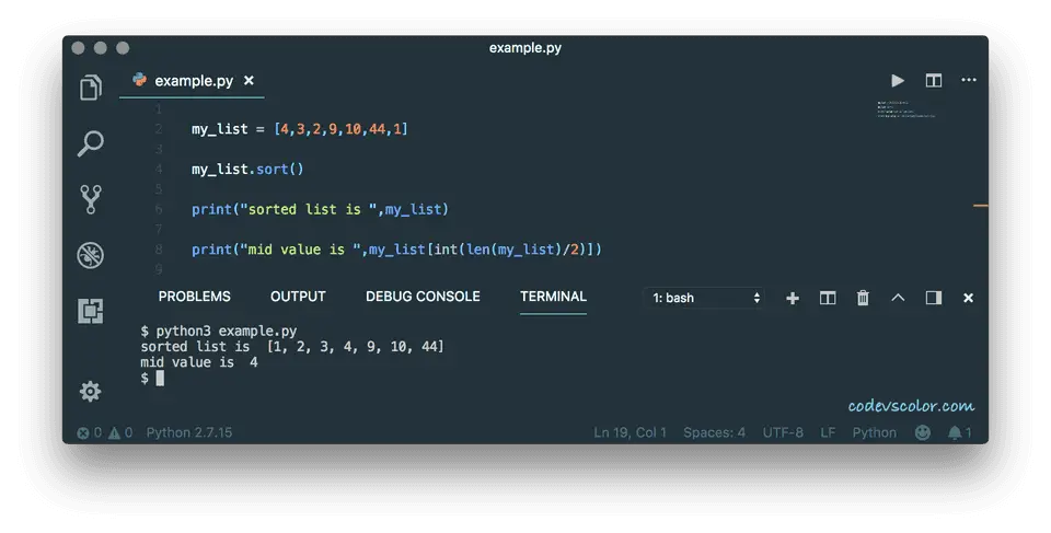 In this Python programming tutorial, we will learn how to find out the middle number of a number list. For example, if the list is [1,6,5,4,3], the mid element is 4. Because two numbers 1,3 are smaller than 4 and two numbers 5,6 are bigger than 4. The list will always contain an odd number of elements.